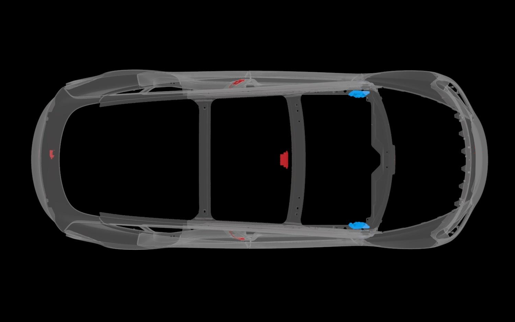 | BLE Endpoints 1. Red objects along vehicle perimeter are the endpoints, LH B-Pillar,RH B-Pillar, and Rear. The center red object is the security controller. 2. The blue objects are Left and Right vehicle controllers. |