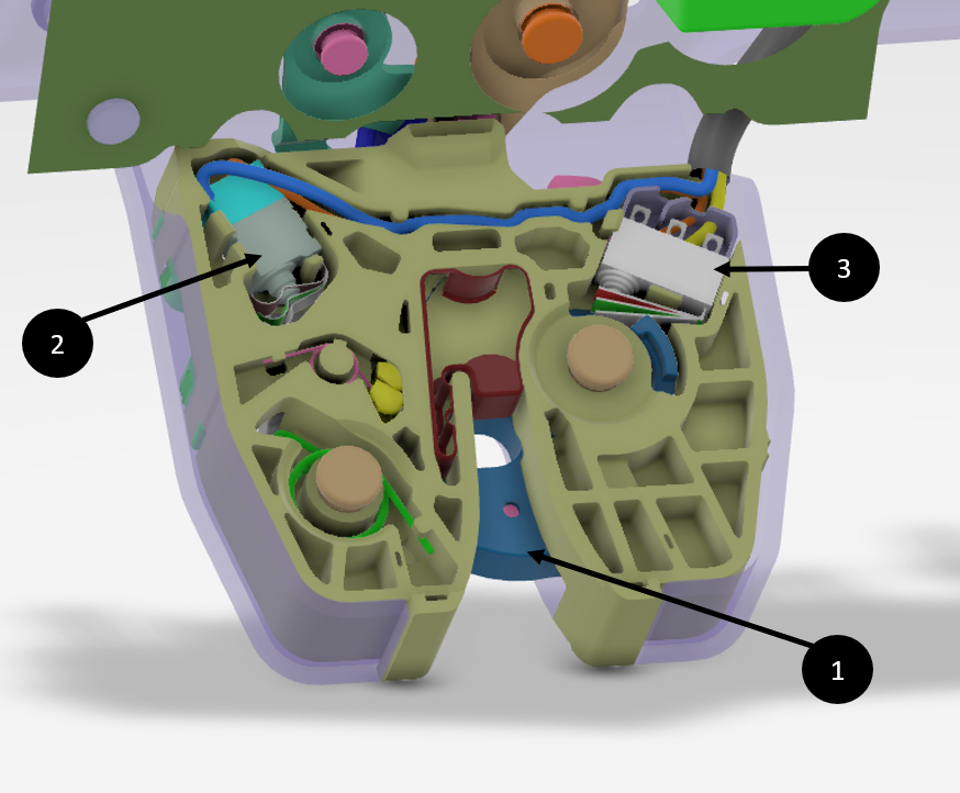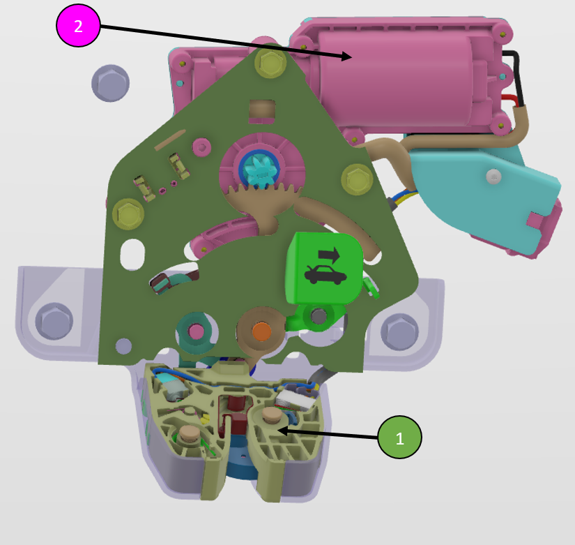 | 1. Latch claw: the portion of the latch that hooks around the striker to ensure closure 2. Pawl switch: indicates if the latch is secondary position 3. Claw switch: indicates if the latch is primary position 4. Latch pawl (not shown on the picture): portion of the latch that moves the claw in and out of place |