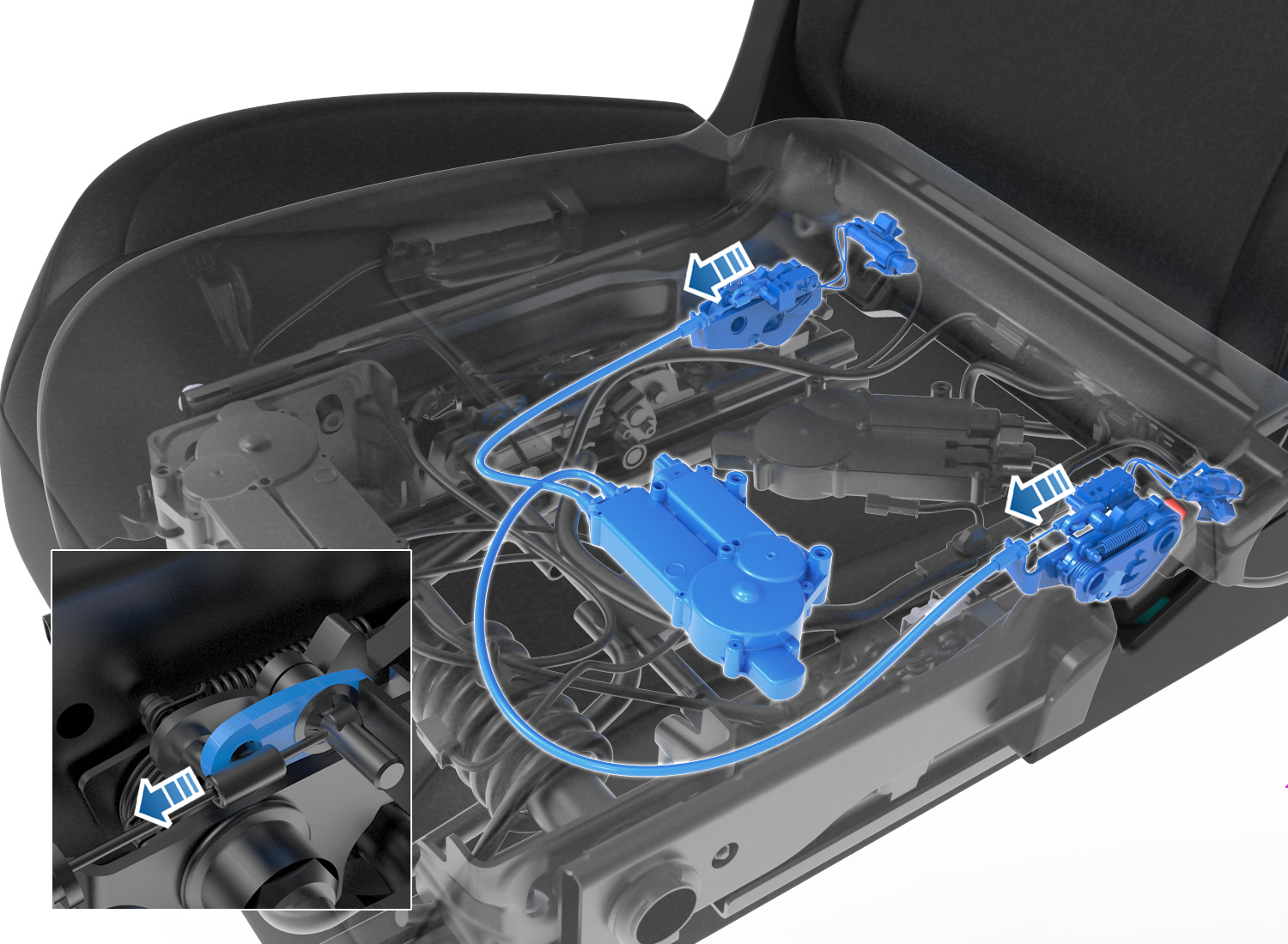The 7 seat interior has Easy Entry track actuators in both the 40% and 60%. The Easy Entry track actuator sets off a series of gear mechanisms that allow the seat to move forward and backward along the track. They are as follows: