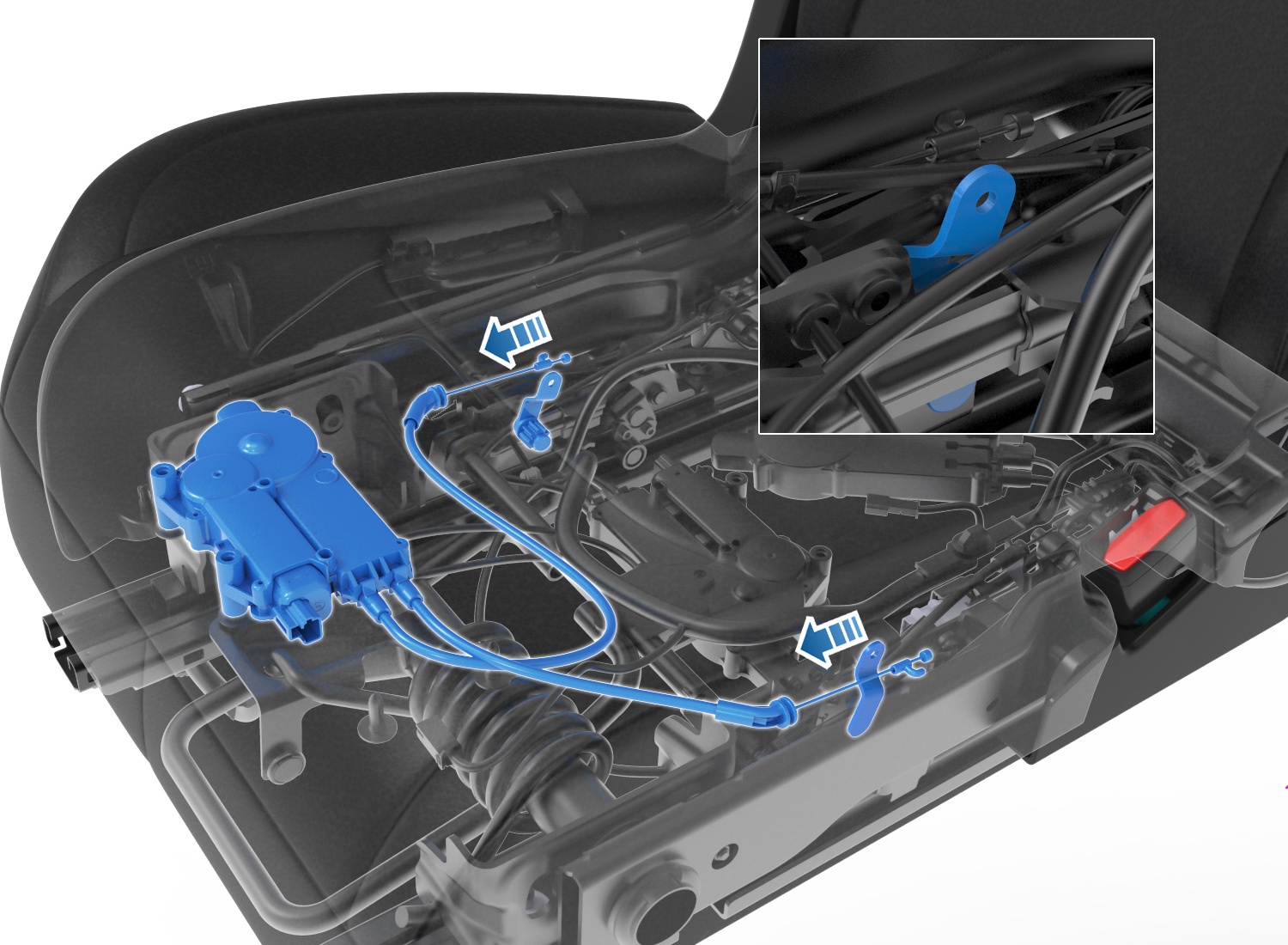 The 7 seat interior has floor latch actuators in both the 40% and 60%. The floor latch actuator moves the floor latches on both the inboard and outboard track to the open position, allowing the seat to pop up off the floor.