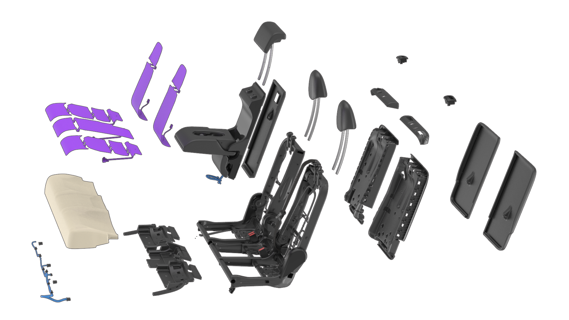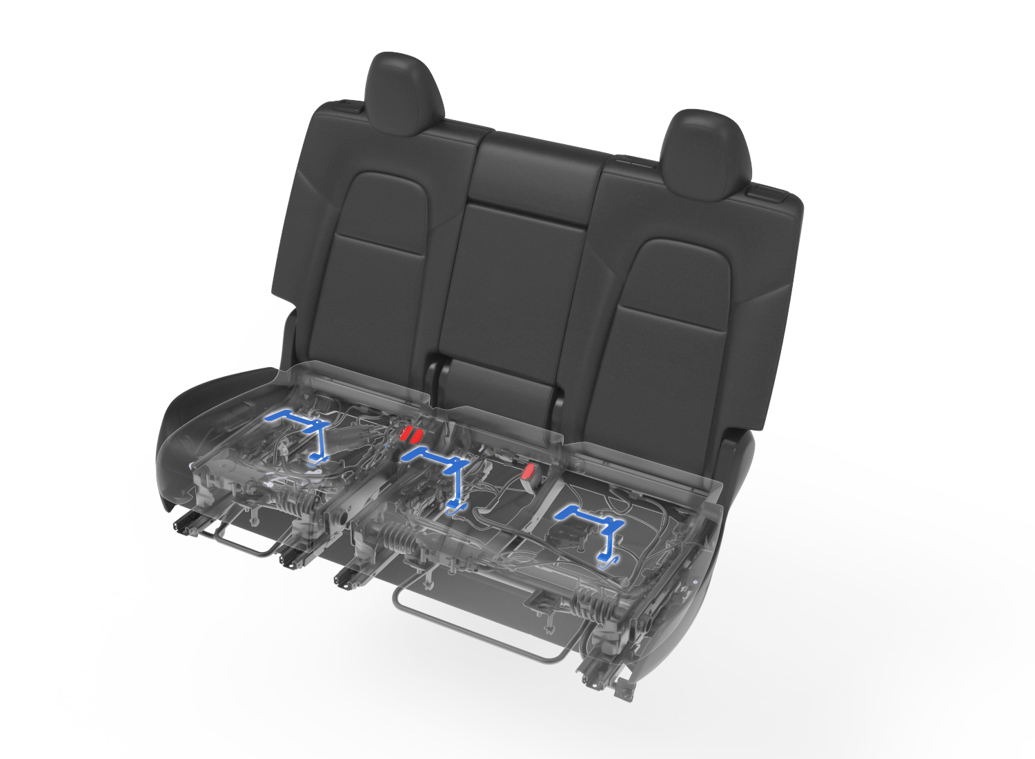 The Model Y second row seats keep shape with the help of the plastic components that support the foam. The cushion pan and the backrest shell allow for the seat cover, pad, seat heater and occupancy sensors to form one assembly that can be easily removed and replaced. For 7 seat interior, the cushion pan is the mounting point for all the second row actuators, except for the 20% recliner actuator.