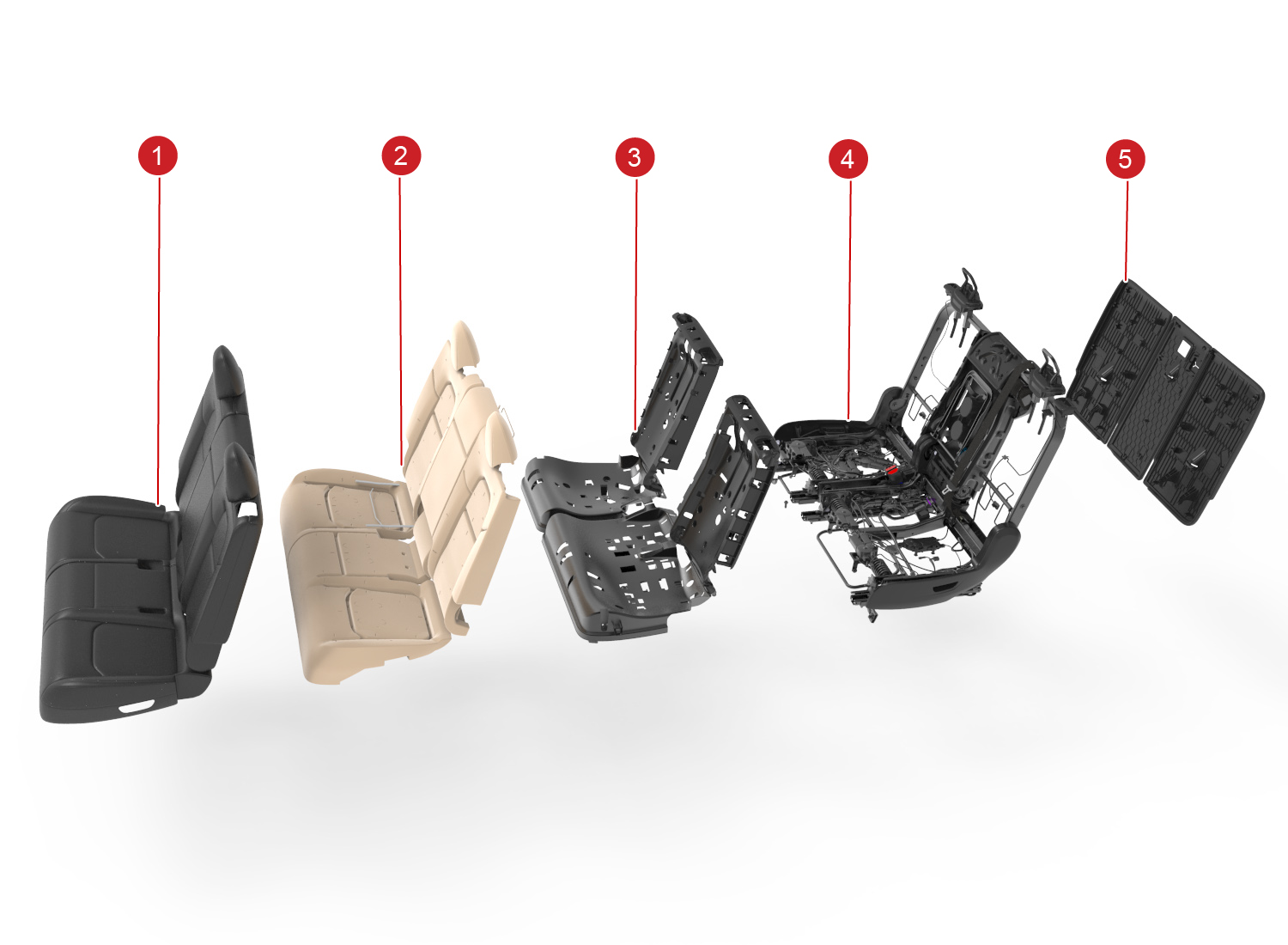 The frame allows for movement in the backrest to both fold flat and comfort adjust into 1 of 5 reclined backrest positions. For 5 seat interior, the seat base is stationary and bolts to the vehicle body.