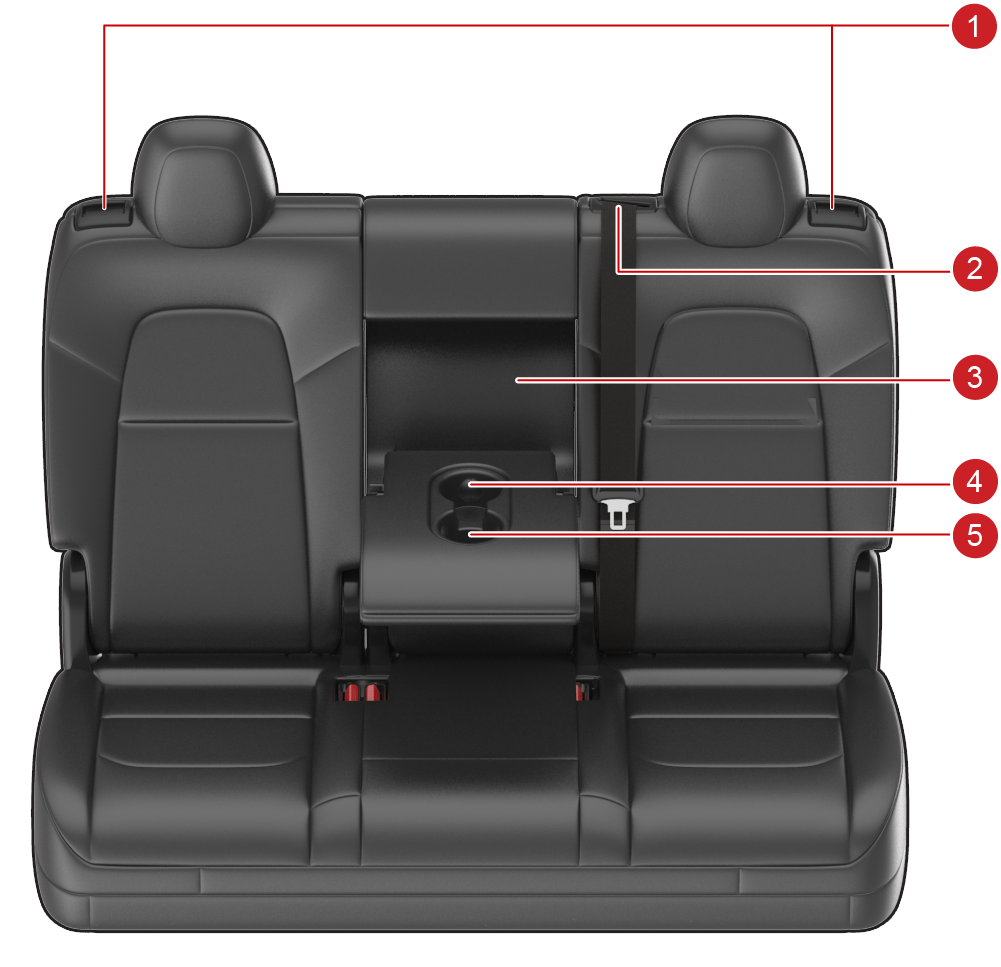 | 1. Fold flat and comfort recline electrical switch 2. Center escutcheon bezel 3. Rear seat console closeout panel 4. Rear seat closeout cup holder liner 5. Rear seat closeout cup holder floor |