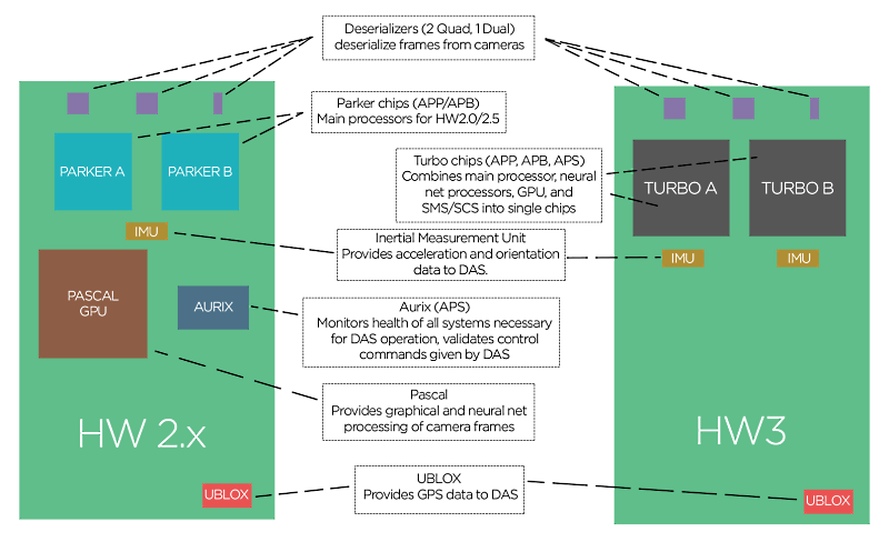 Many of the functions previously distributed across several chips in HW2.5 and earlier have been brought on to a single chip on HW3, called Turbo. There are 2 Turbo chips located on the HW3 circuit board.