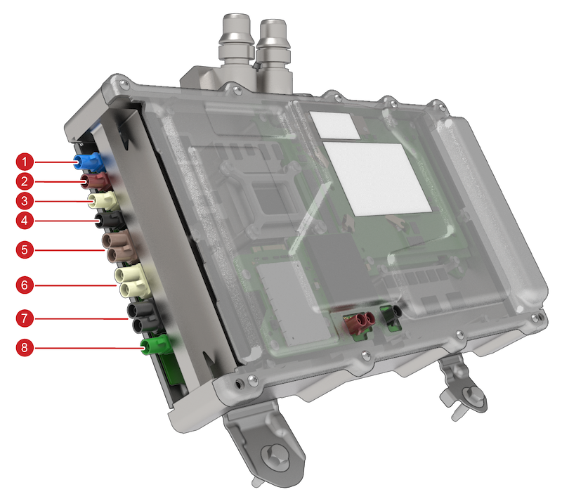 | 1. GNSS Antenna 2. Rear-view camera - input 3. Cabin camera 4. Main camera 5. Side repeater cameras 6. B-Pillar cameras 7. Narrow and fisheye cameras 8. Not connected / Diagnostic port |