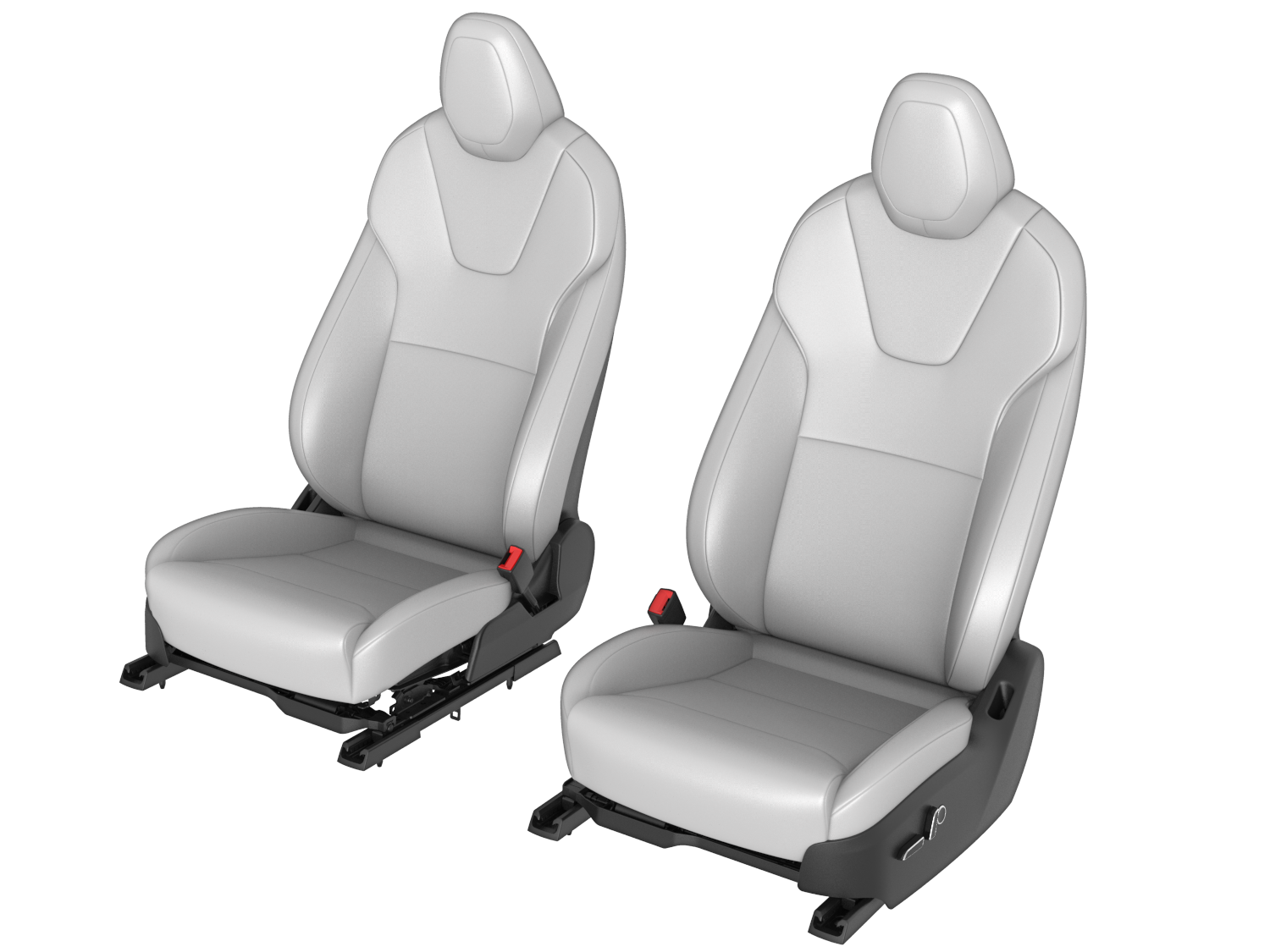 The first row seats are perforated on the centermost panels to allow for seat ventilation. Performance variant first row seats also have perforation on the inner bolsters. On the performance variant, where the inner bolster meets the outer bolster, there is piping for added detail and luxury. A portion of the seat cover is concealed by the outer and inner side shield, these parts of the seat cover are an anti-squeak textile material to prevent any noise concerns as the seat cushion moves through the ranges of motion.