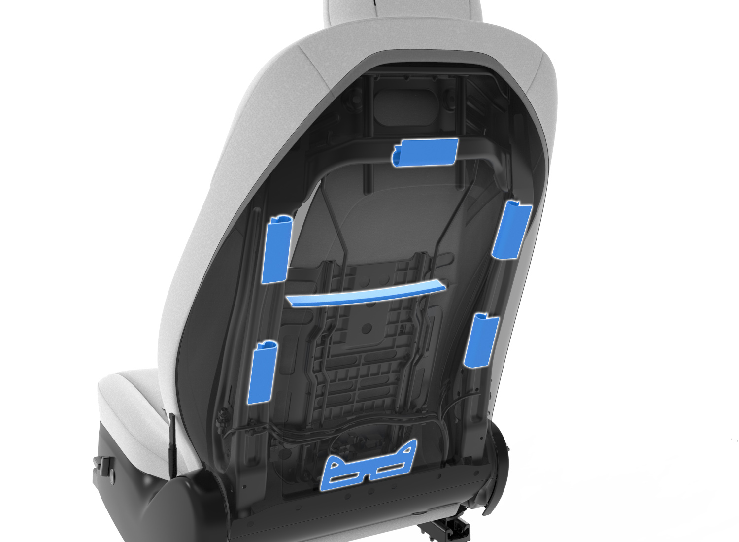 The front seat structure is comprised of two main assemblies, the cushion assembly and the backrest assembly. The main assemblies are each built separately then assembled together to form the full structure. Each assembly has a metal frame, electronics and harness, foam cushion, restraint components, and trim covers. The front seat frame is made out of laser welded steel alloy metal. The seat cushion frame has a cushion spring to add non-rigid support.