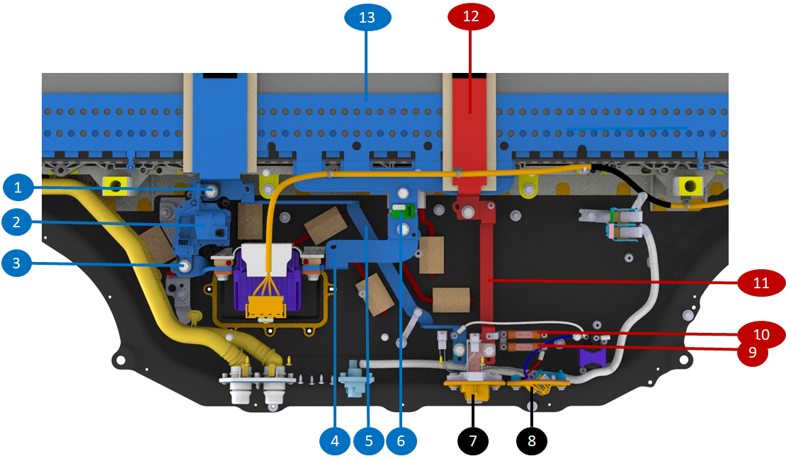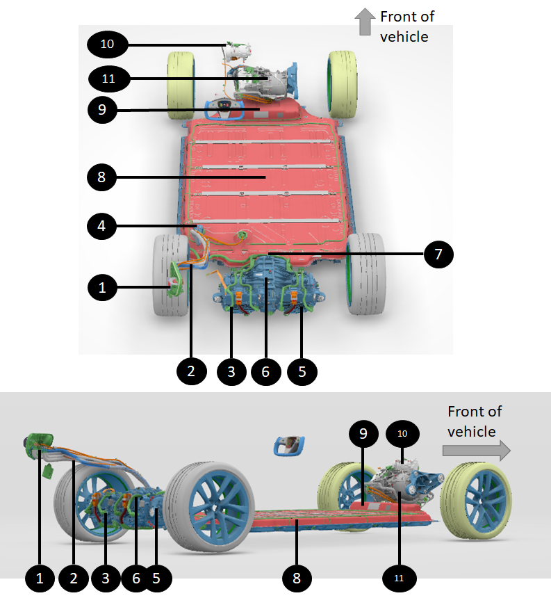 | 1. Voltage built up from most negative to most positive terminal via each brick, each module 2. Rear drive unit #1 HV connector 3. Positive contactor 4. Rear drive unit #2 HV connector 5. Most positive terminal 6. Positive busbar bringing DC link positive to the front of the HV battery 7. Negative busbar bringing DC link negative to the rear of the HV battery 8. Most negative terminal 9. Heat pump HV connector 10. Front drive unit HV connector 11. Negative contactor |