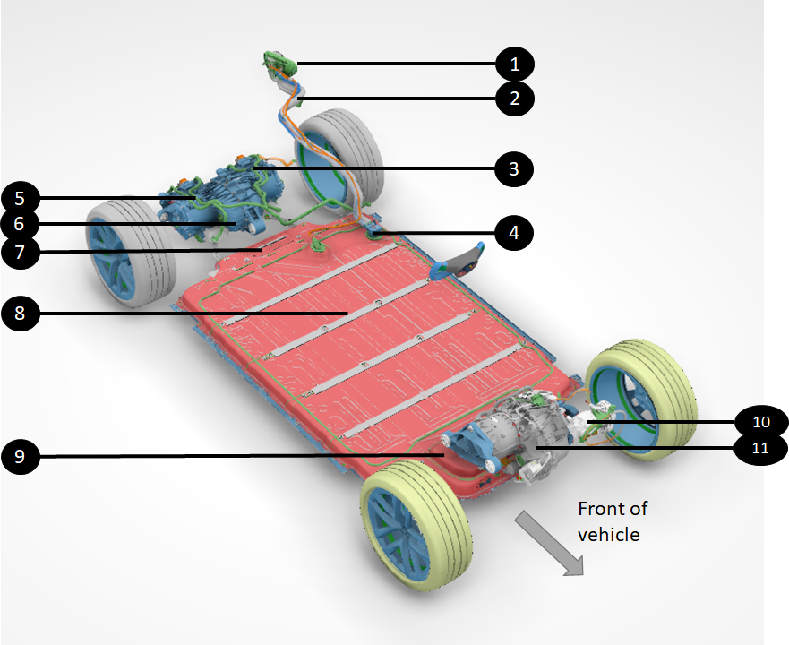 | 1. Charge port 2. Charge port busbars 3. Left rear performance drive unit 4. HV battery inlet charge port busbar connector 5. Right rear performance drive unit 6. Rear gearbox 7. HV battery rear service access panel 8. High voltage battery 9. HV battery front ancillary bay 10. Heat pump compressor 11. Front drive unit |