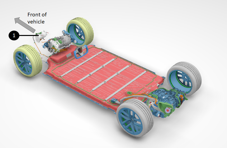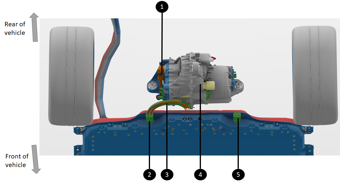 | 1. Charge port to DC link connections for single-phase AC charging in NA (different routing at start of production - straight from DC charge port inlet to PCS) 2. (Not present at start of production) - AC charge connector for three-phase markets - Connected to a jumper dummy plug for single-phase market. 3. Harness bundle taking AC signals from rear of HV battery to PCS at front ancillary bay 4. HV connector to PCS (connect DC link to PCS) 5. Harness bundle taking AC signals from rear of HV battery to PCS at front ancillary bay . PCS AC input connector |