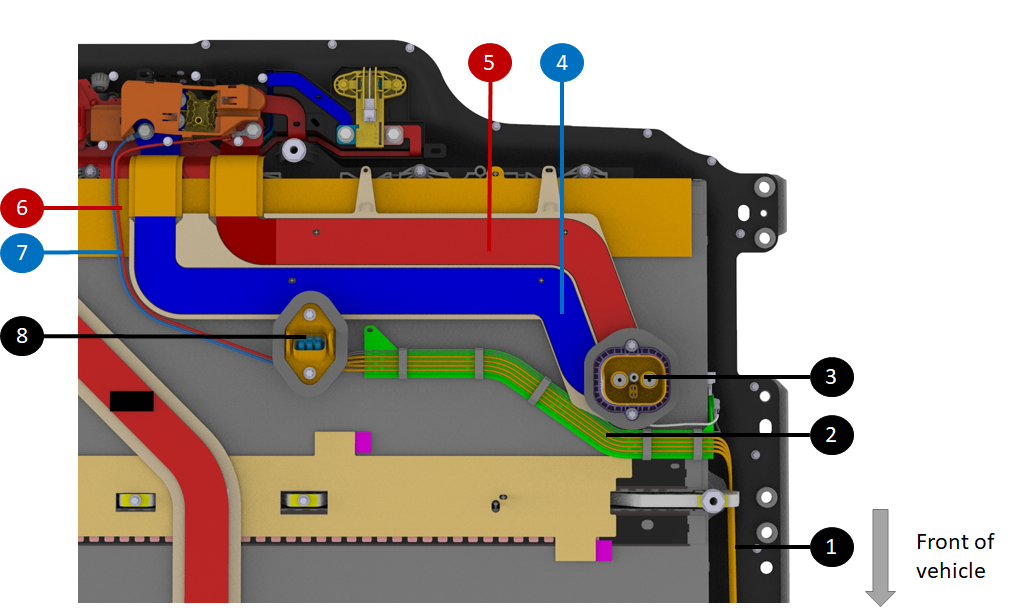 | 1. Harness bundle taking AC signals from the rear of the HV battery to PCS at the front ancillary bay 2. Same harness spread under the HV battery enclosure 3. HV battery inlet charge port busbar connector 4. Single busbar to charge port (negative when DC charging, single-phase when AC charging in NA) 5. Single busbar to charge port (positive when DC charging, single-phase when AC charging in NA) 6 & 7. Charge port to DC link connections for single-phase AC charging in NA (different routing at start of production - straight from DC charge port inlet to PCS) 8. (Not present at start of production) - AC charge connector for three-phase markets - Connected to a jumper dummy plug for single-phase market |