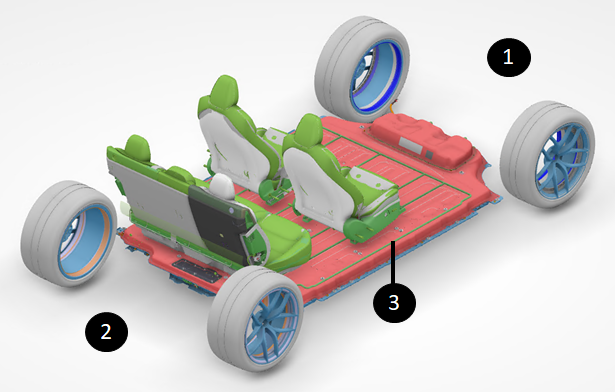 | 1. Front of vehicle 2. Rear of vehicle 3. HV battery |