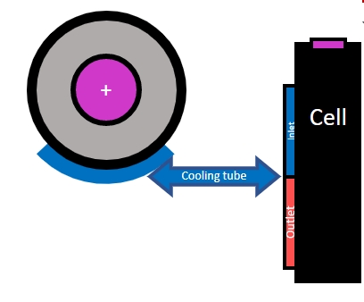 The diagram below shows a top and section view of this cooling tube against a cell. The diagram shows the cooling tube hugging the cell and the section shows the split within the cooling tube between inlet and outlet.