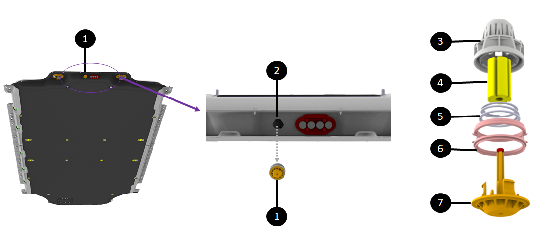 | 1. Flood port on rear flange of HV battery enclosure 2. Opening in enclosure for flood port where liquid will exit when flood port opens 3. Flood port basket housing preventing blockage 4. Cellulose element 5. Spring load allowing the valve to shoot down when cellulose element dissolves 6. Flood port carrier 7. Valve pushed down in presence of liquid |
