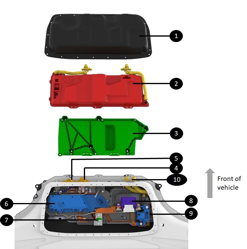 | 1. Front Ancillary Bay cover 2. PCS 3. Tray for PCS mounting 4. Front Drive Unit HV connector 5. Heat pump compressor HV connector 6. High voltage controller 7. Shunt 8. Pyro-disconnect 9. Negative contactor 10. Coolant manifold for module coolant loop |