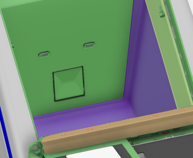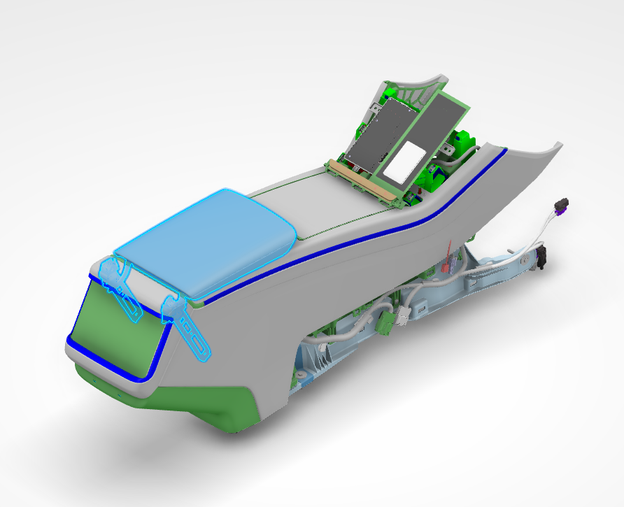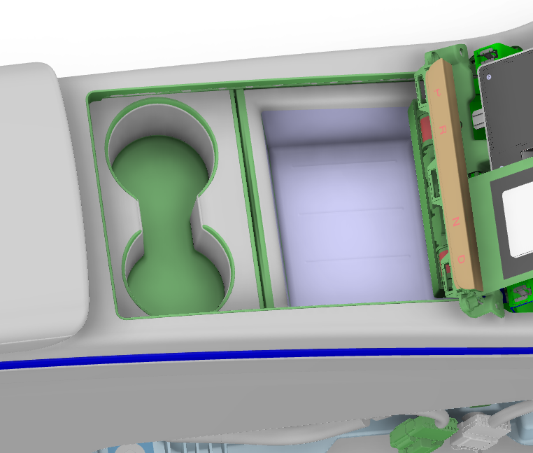 Within the front bin is a service panel. This service panel contains 2 USB-C charging with data ports and an LV outlet. This service panel is easily removable without having to remove the entire center console. The front bin has functional ambient lighting which is illuminated by switches located in the center console that trigger when certain components are in the stowed position, allowing access to the front bin. There are two switches for the bin lid: one switch for the sliding tray and one switch for the cupholder.