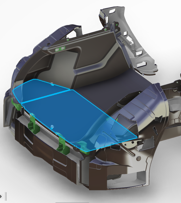 The 2021+ Model S parcel shelf provides coverage for items located in the trunk. The parcel shelf folds in half and can be stowed in the trunk tub. The parcel shelf attaches to the vehicle via magnets located in each of the four corners.