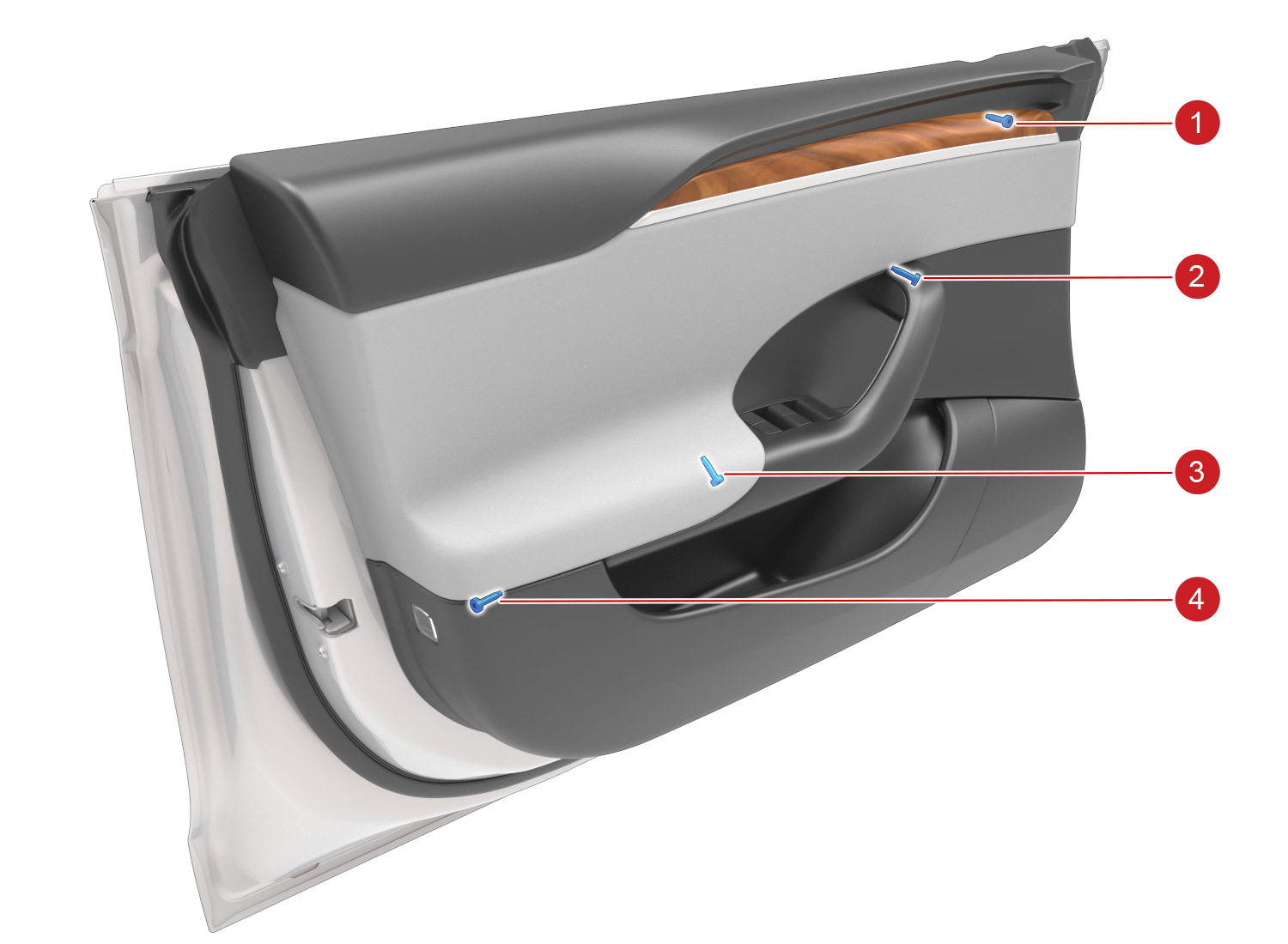 The door trim panels hook onto the door at the beltline seal. Each door has a bolt under the service panel located on the armrest, under the screw cover, under the decor, and under the reflector.