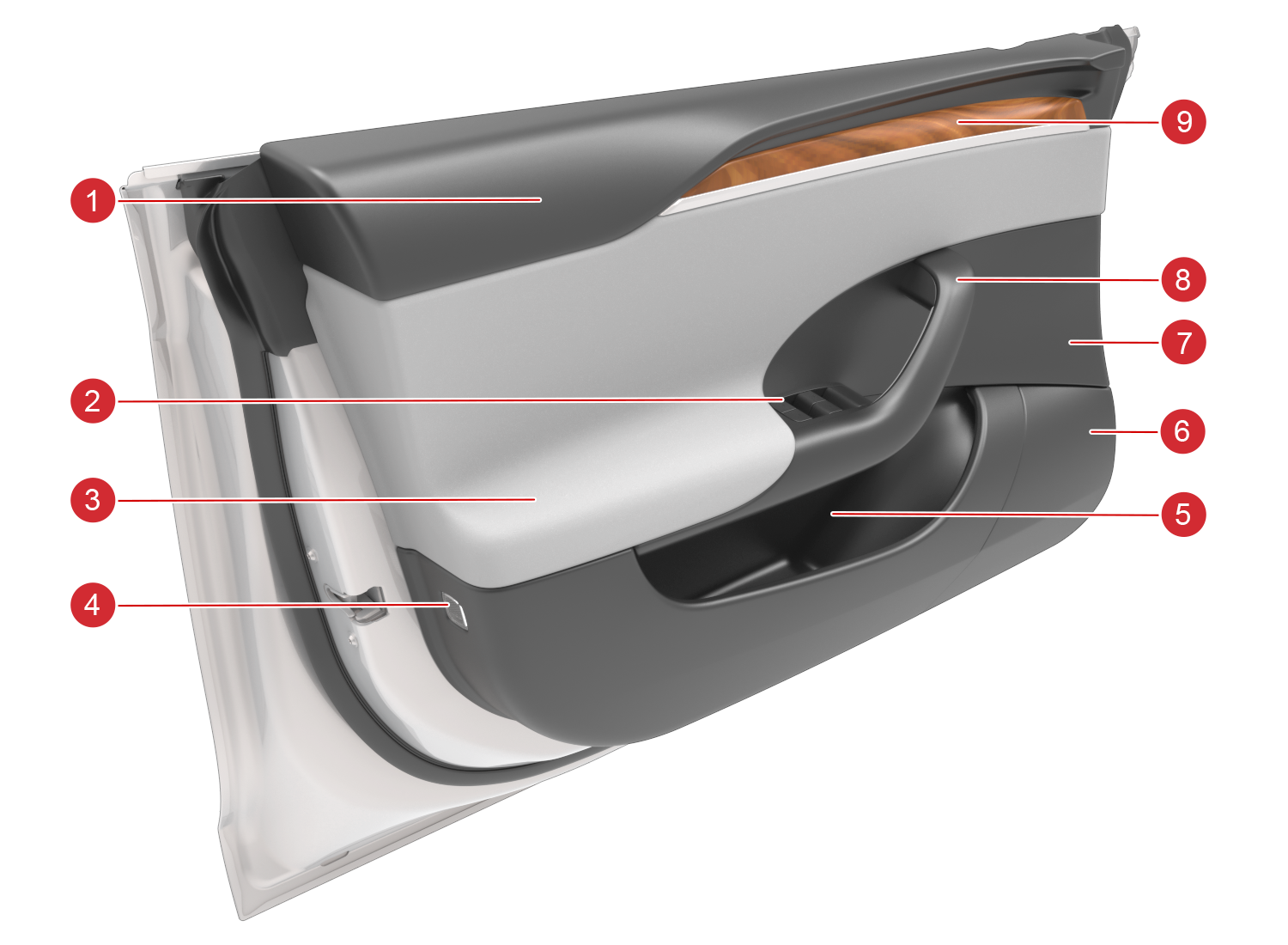 | 1. Beltline 2. Window switch pack & emergency release 3. Armrest 4. Door reflector 5. Map pocket bin 6. Speaker grille 7. Speaker mesh 8. Grab handle 9. Decor |