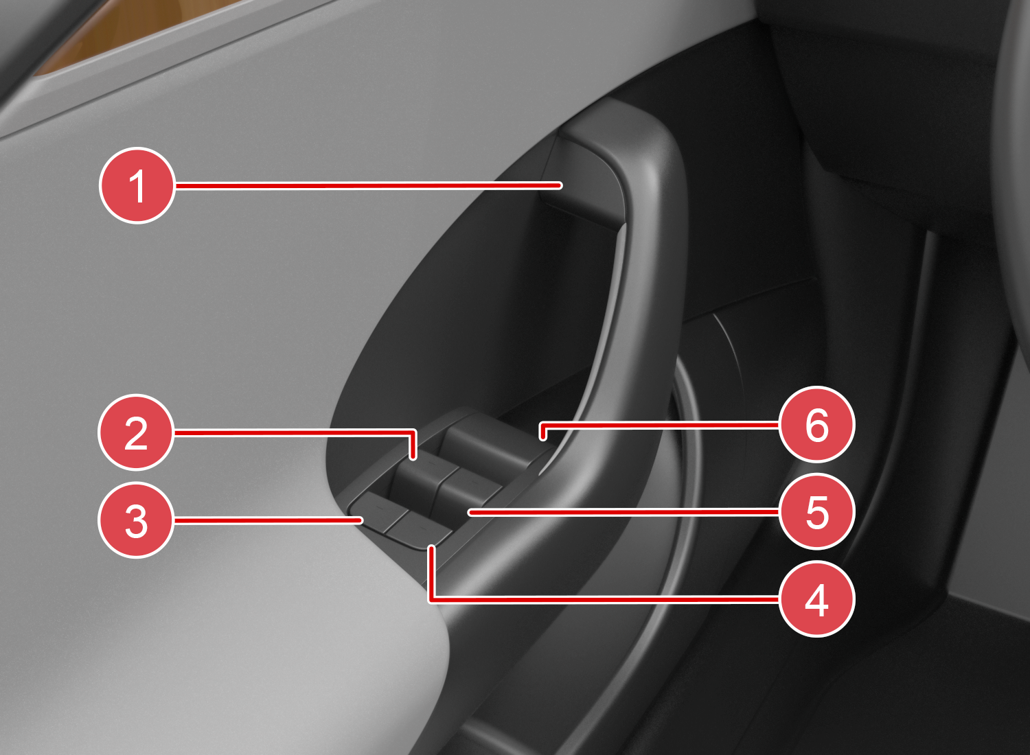 | 1. Capacitive interior release button 2. Window switch, front left function 3. Window switch, rear left function 4. Window switch, rear right function 5. Window switch, front right function 6. Emergency door release lever |