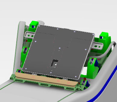 The 2021+ Model S display built after 18-APR-2022 has the ability to tilt towards the driver or passenger. There are 3 possible positions: tilted 12° to the driver, a center home position (also referred to as stowed), and tilted 12° to the passenger. This system includes the display itself and the tilt mechanism, which is then bolted to a bracket that mounts to the instrument panel (IP). The tilt mechanism is comprised of two motors and each provide linear movement via a spindle. The display is connected to this tilt mechanism at three points: each of the arms that are attached to the spindle as well as the center arm that has the guide pin which allows for a smooth movement as the display tilts. The mechanism slides into the IP in the X direction and is bolted to the bracket in the X direction. The tilt functionality can be requested via the UI.