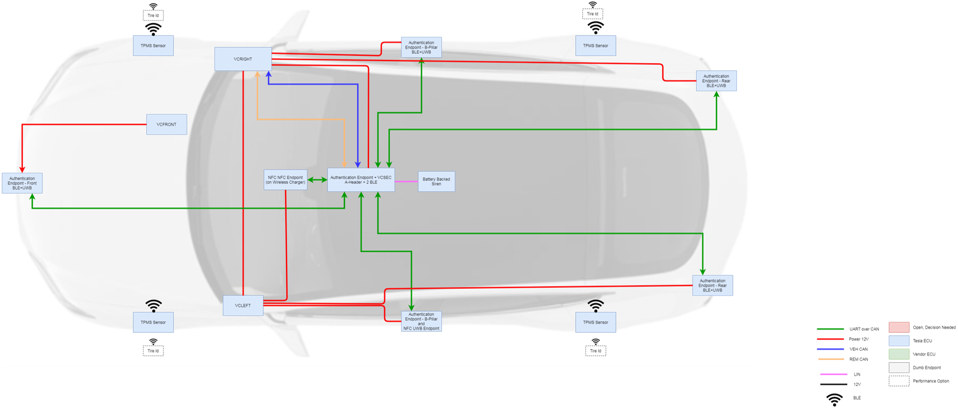 The security controller (VCSEC) is powered by the right vehicle controller (VCRIGHT). The left hand (LH) B-pillar and left rear Bluetooth Low Energy (BLE) endpoint antennas receive power from the left vehicle controller (VCLEFT). The right hand (RH) B-pillar and right rear BLE antennas receive power from VCRIGHT, while the front BLE antenna is powered by the front vehicle controller (VCFRONT).