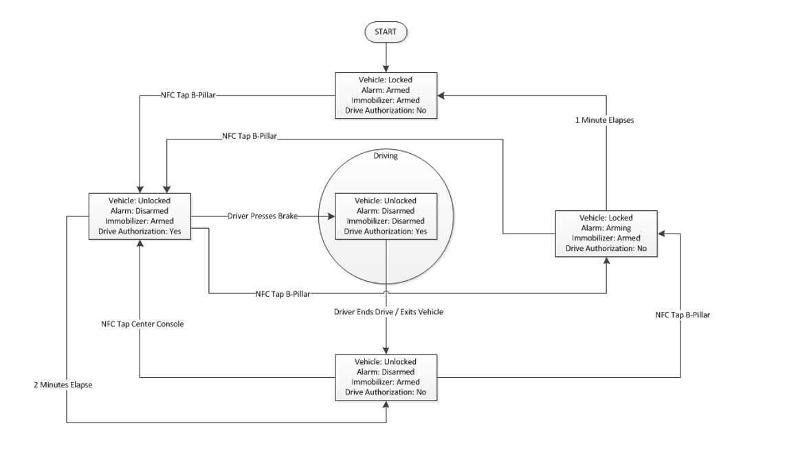 The NFC readers on the vehicle have multiple power states to reduce power consumption and prevent unwanted interaction with NFC devices if already authenticated. The reader performance is at maximum in the Always Read power state, which it enters when it can anticipate user interaction (door handle pull for B-pillar reader or Accessory state for touchscreen reader) or when it attempts to read an NFC card from the low power state (Read on Wake). Pulling the driver door handle will keep the B-pillar reader in Always Read for 20 seconds and can improve key card authentication performance if the first attempt does not succeed.