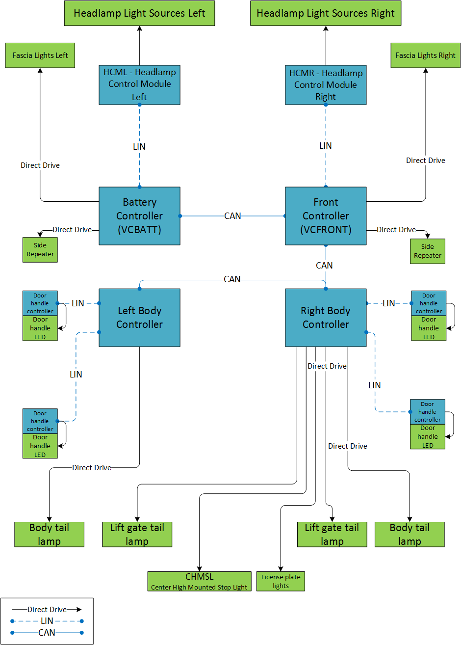 The exterior lighting system control is distributed between the vehicle controllers as depicted in the diagram below. The front headlamps have their own ECU and are receiving signals from the vehicle controllers over LIN bus. The rear lights consist of the body and lift gate tail, stop lights, and the license plate lights. They are managed by the left and right body controllers.