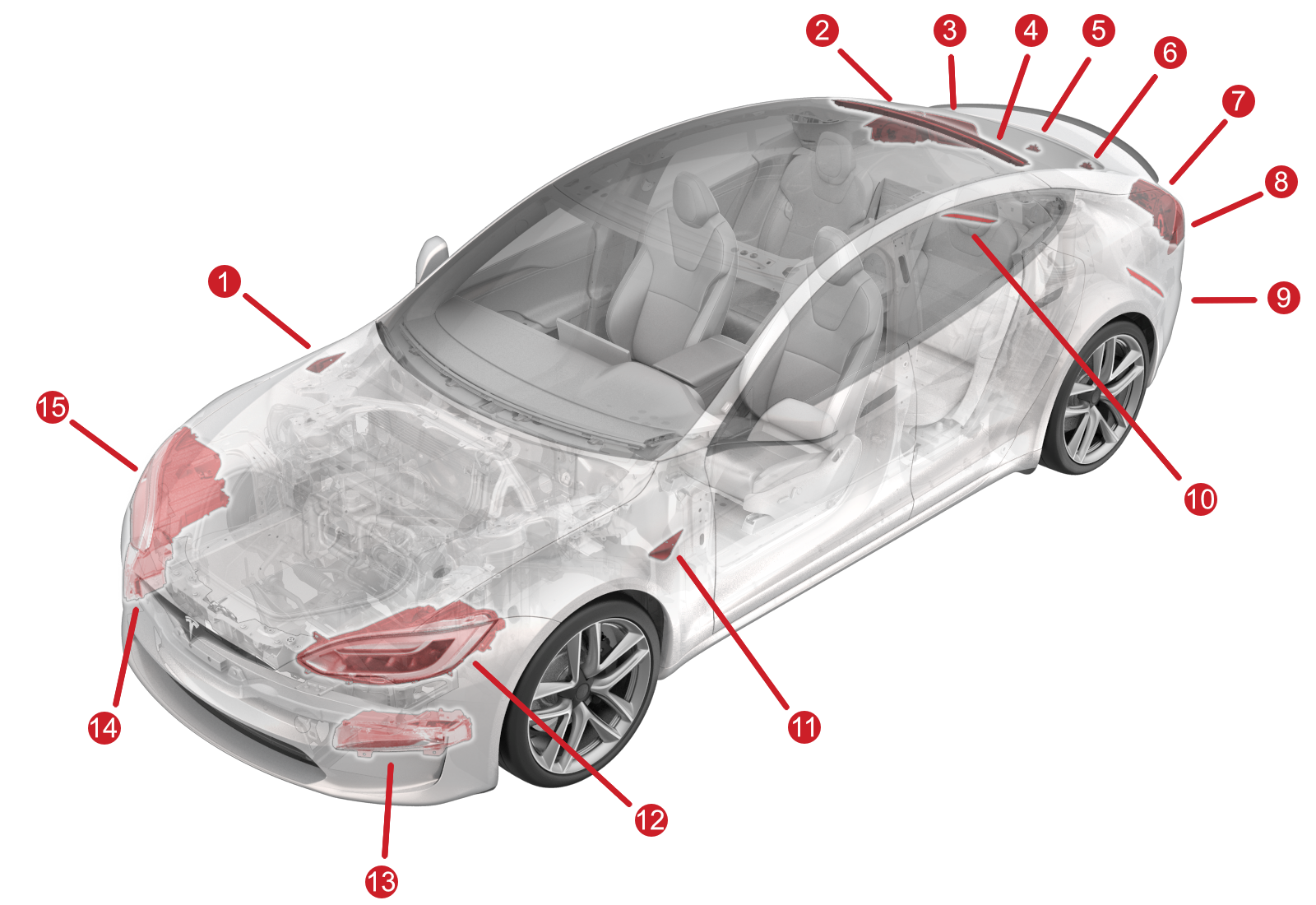 | 1. Side repeater camera assembly (2021+ Model S update) 2. Body tail lamp 3. Lift gate tail lamp 4. Center high mounted stop light (CHMSL) 5. License plate lamp 6. License plate lamp 7. Lift gate tail lamp 8. Body tail lamp 9. Rear reflex reflector 10. Rear reflex reflector 11. Side repeater camera assembly (2021+ Model S update) 12. Headlamp assembly 13. Fascia lamp (2021+ Model S update) 14. Fascia lamp (2021+ Model S update) 15. Headlamp assembly |