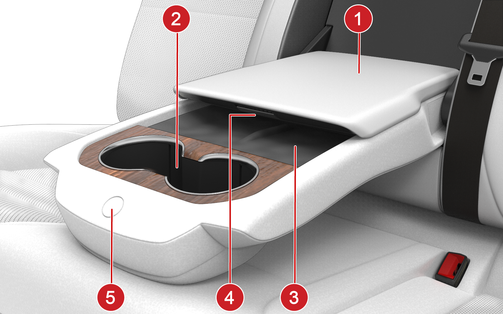 | 1. Compartment lid 2. Cup holders 3. Inductive charger 4. Compartment lid latch 5. Armrest switch |