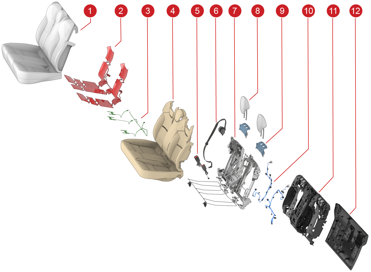 | 1. Cover 2. Heat Pad 3. Occupancy Sensors 4. Foam/Pad 5. Seat belt buckle 6. Center Seat Belt Retractor 7. Seat Frame 8. Headrest 9. Seat Audio/Microphone 10. Wire harness 11. Seat plastics 12. Back Panels |