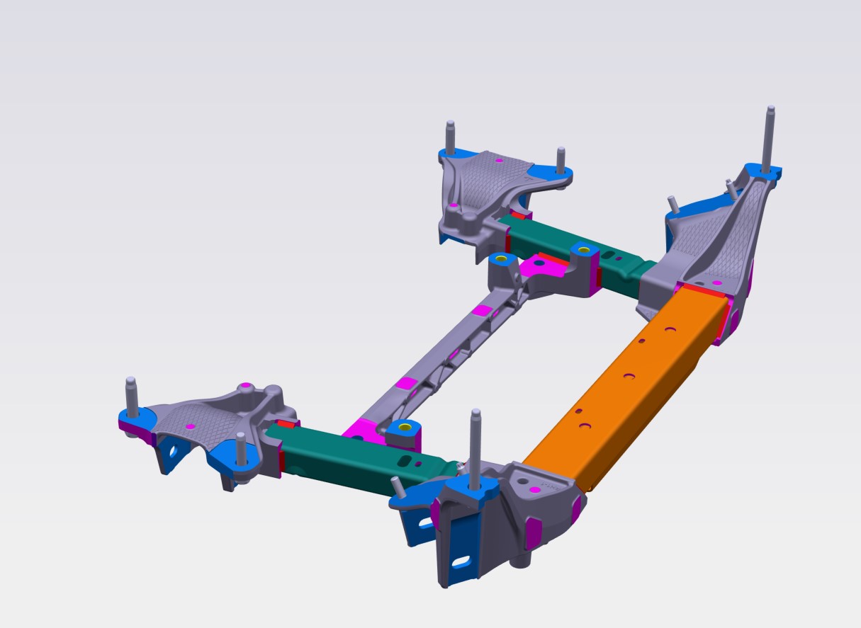 The rear subframe is a multiple piece, diecast component that contains fixtures for the multilink suspension, stabilizer bar, and rear drive unit.