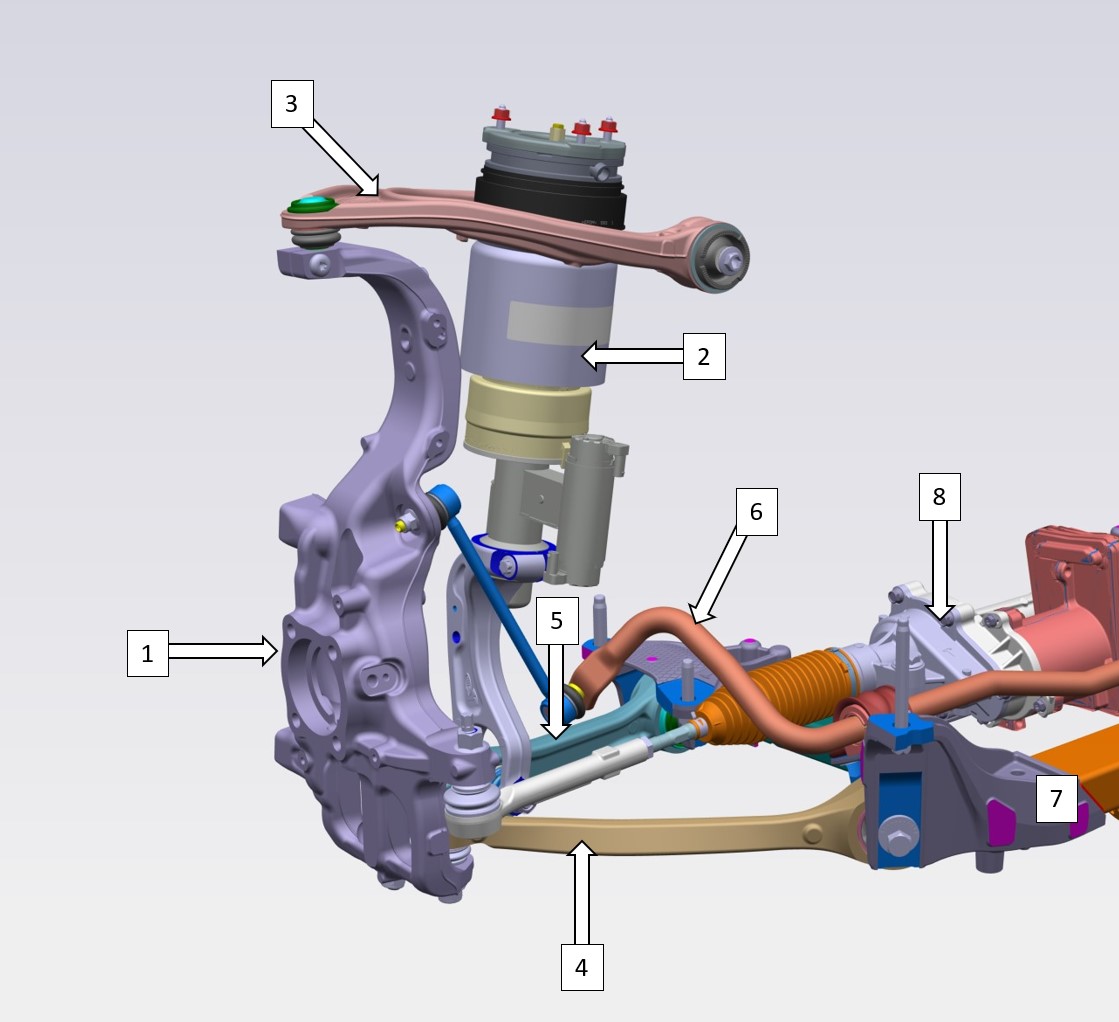 | 1. Knuckle 2. Air spring module 3. Upper control arm 4. Fore link 5. Aft link 6. Stabilzer bar 7. Subframe 8. Power steering |