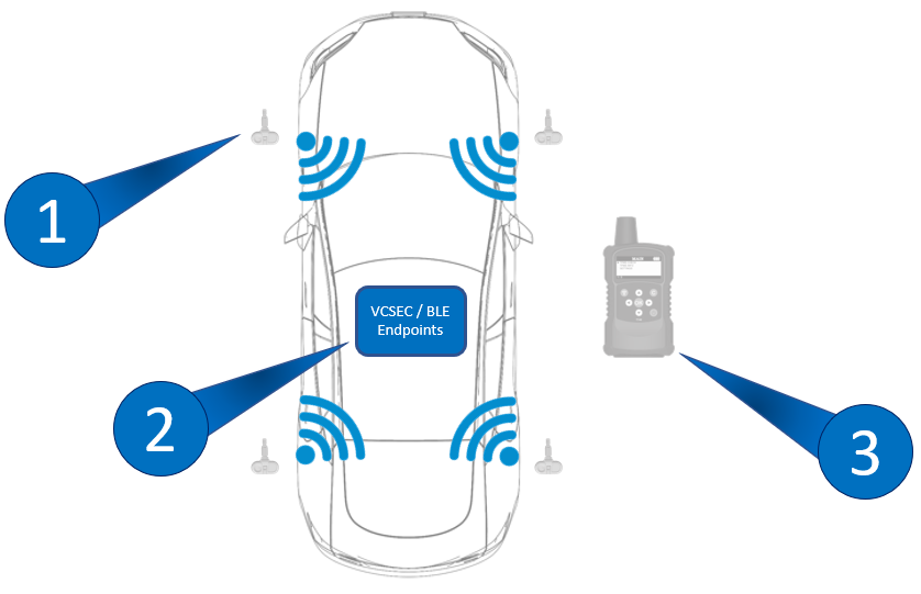 | 1. BLE TPMS Wheel Sensor 2. VCSEC / BLE Endpoints 3. TPMS Service Tool |