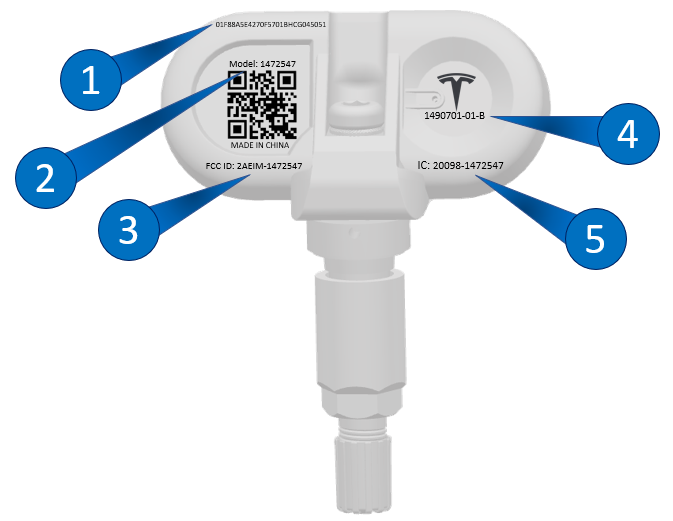 | 1. TPMS ID (ID that TPMS uses to identify the Wheel Sensor) 2. Model 3. Federal Communications Commission Identification number 4. Tesla Part Number 5. Industry Canada's license |