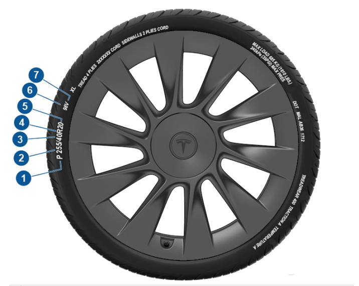 | 1. Tire category. P indicates that the tire is for passenger vehicles. 2. Tire width 3. Aspect ratio 4. Tire construction. R indicates that the tire is Radial ply. 5. Wheel diameter 6. Load index, this 2 or 3-digit number is the weight each tire can support. 7. Speed rating, this single letter indicates the maximum speed (in mph) at which the tire can be used for extended periods. |