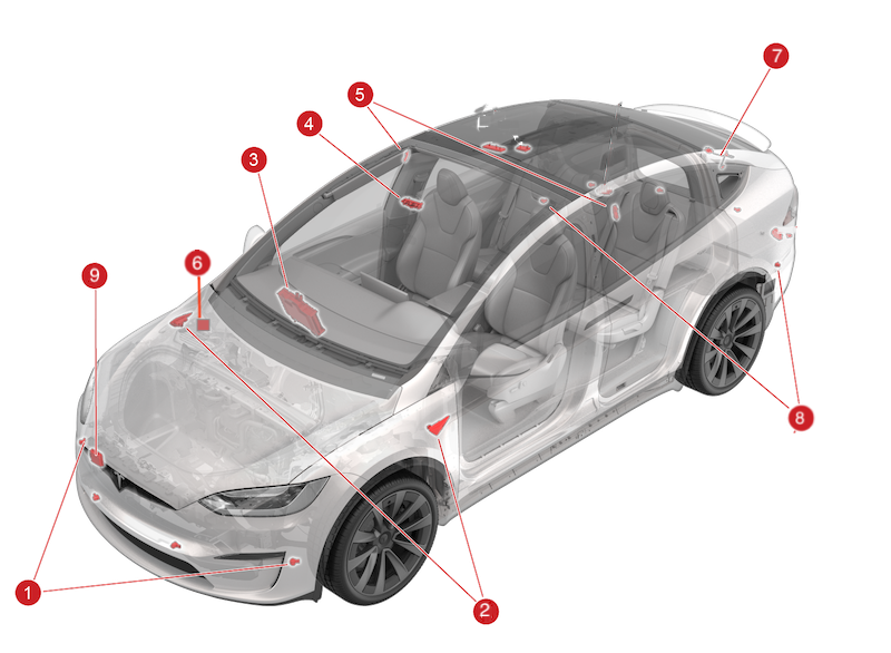 | 1. Front ultrasonic sensors (x6) 2. Side repeater cameras (x2) 3. Driver Assistance Electronic Control Unit (ECU) 4. Forward-facing camera assembly with 3 cameras 5. B-Pillar cameras (x2) 6. Park Assist ECU 7. Rear view camera 8. Rear ultrasonic sensors (x6) 9. Radar sensor |