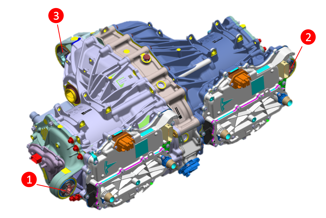 Drive units are secured to the vehicle by three mounts in order to resist axial and rotational forces. Torque is transmitted to each wheel via half shafts connected to the drive unit output flanges. Each drive unit gives motion to the wheels in the respective axle. The two drive units are not mechanically connected to each other.