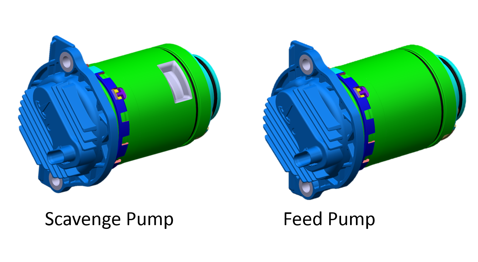 Due to the dry sump design, the Plaid rear drive unit has two types of oil pumps. Two scavenge pumps, and one feed pump. The performance characteristics of each pump type are optimized for their application, hence these components are not interchangeable. The scavenge pump has an additional inlet on the side of the housing.
