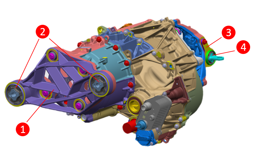 - A left mount, bolted on the gearbox housing above the drive inverter