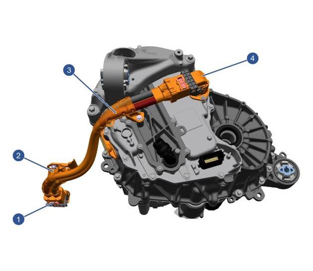 | 1. HV battery connector 2. Drive inverter DC voltage bracket 3. Drive inverter DC voltage bracket 4. Drive unit connector |
