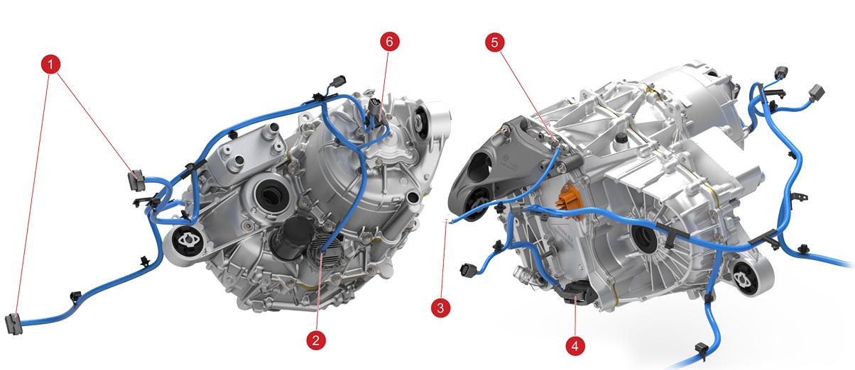 | 1. Rear subframe harness connectors to body 2. Oil pump connector 3. Ground to chassis 4. Drive inverter logic connector 5. Ground attachment 6. Resolver |