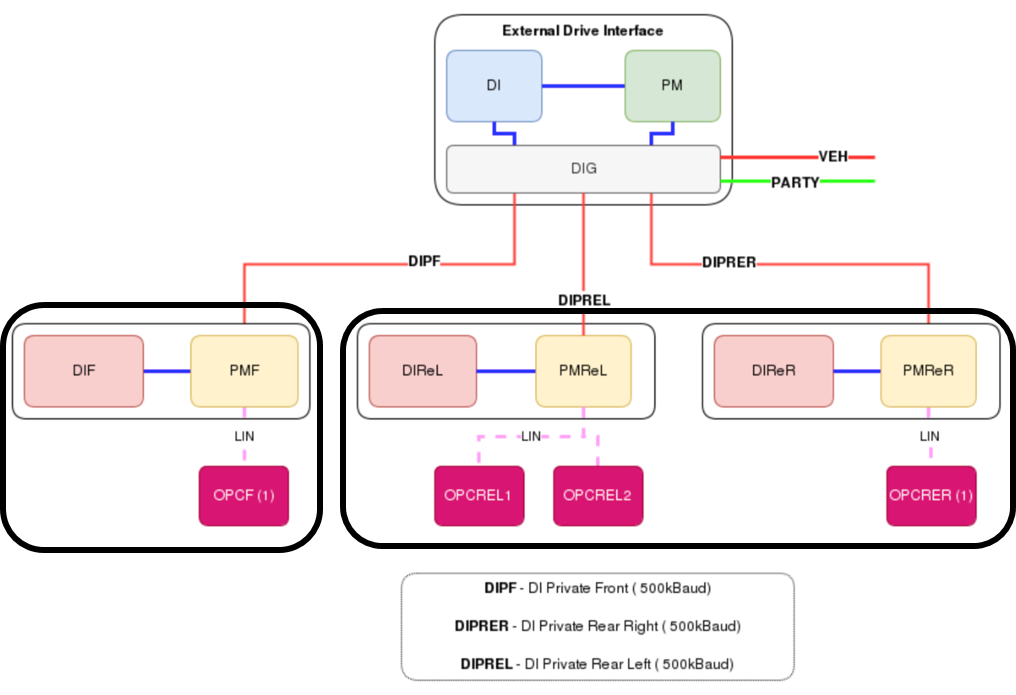 Drive inverter communication architecture on 2021+ Model X is different from previous vehicle models. The new architecture consists of an external system torque processor, named "Drive Interface", which is relocated to the left vehicle controller (VCLEFT). The Drive Interface gets inputs from the gear selector, the accelerator pedal, and the brakes in order to define the operating condition and sends appropriate torque requests to all unit inverters via independent private CAN buses. The Drive Interface has 3 controllers. In addition to the DI and PM controllers, that all unit inverters have, it has a Drive Interface Gateway (DIG), which handles the communication between the private CAN buses and the Vehicle and Party CAN.