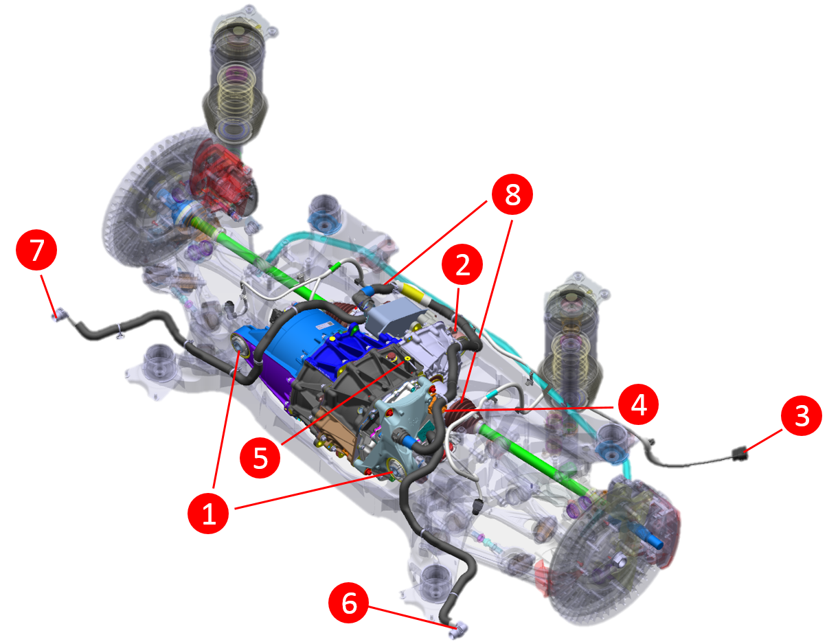 | 1. Left/Right drive unit mount to subframe 2. Front drive unit mount to subframe 3. Rear subframe low voltage harness connectors (to body) 4. HV battery connections to rear drive unit 5. Drive unit chassis ground point 6. Rear subframe coolant inlet 7. Rear subframe coolant outlet 8. Halfshafts |