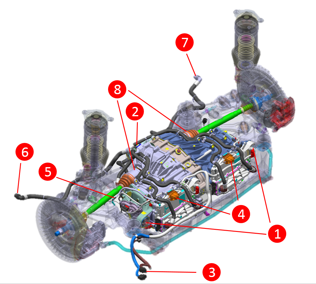 | 1. Clevis mount 2. Torque reaction arm (TRA) 3. Front subframe low voltage harness connector 4. Drive unit chassis ground point 5. HV battery connector to front drive unit 6. Front drive unit coolant inlet 7. Front drive unit coolant outlet (two for performance variant) 8. Halfshafts |