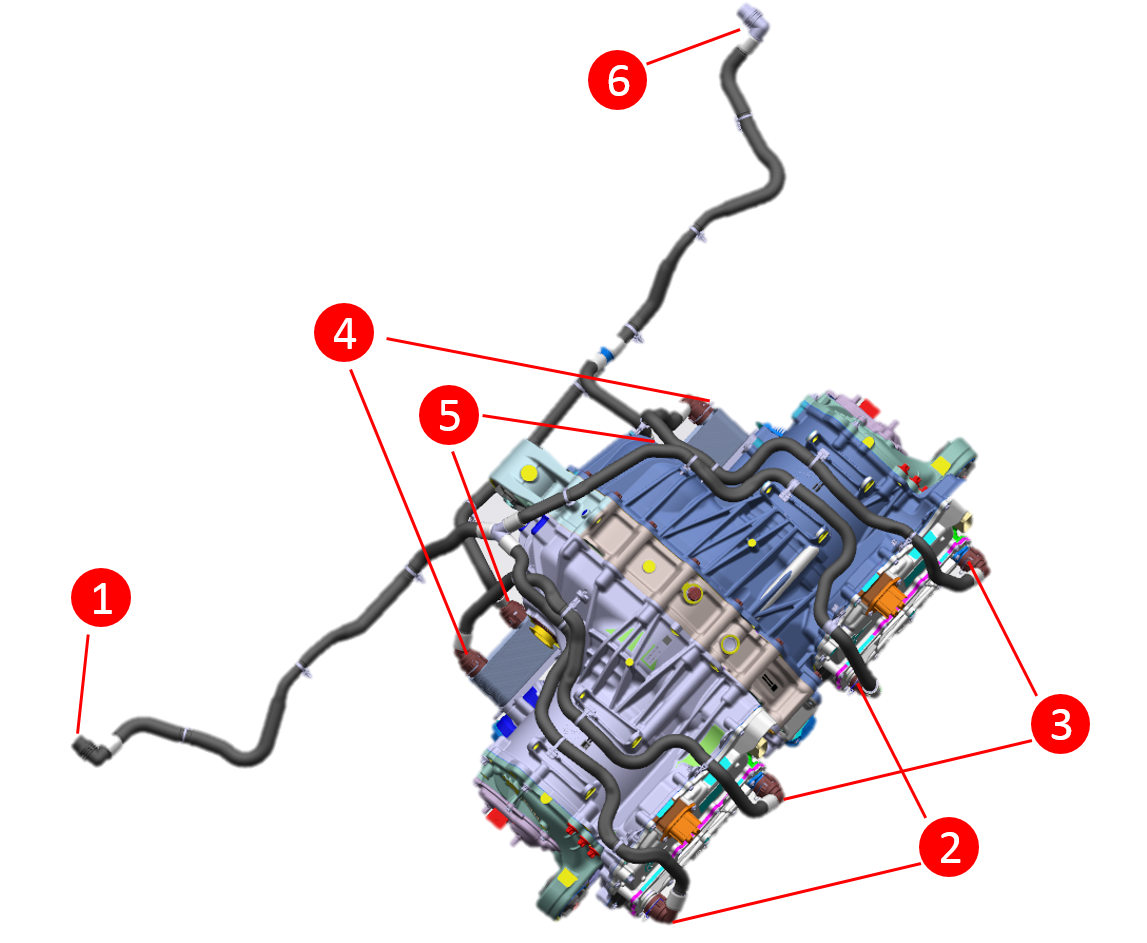 | 1. Rear subframe coolant inlet 2. Drive inverter coolant inlet 3. Drive inverter coolant outlet 4. Heat exchanger coolant inlet 5. Heat exchanger coolant outlet 6. Rear subframe coolant outlet |