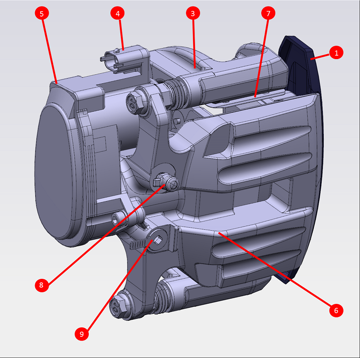 | 1. cover 2. brake pads 3. caliper carrier 4. EPB connector 5. EPB motor 6. caliper body 7. brake pad anti-rattle shim 8. bleed nipple 9. plug |