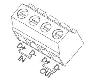 Each Wall Connector has a terminal block as shown in the figure below. D+ is the positive terminal and D- is the negative terminal. Form a daisy-chained network by connecting the cable positive wire between each positive terminal block of the participating Wall Connectors; repeat this procedure for the cable negative wire, which you connect between the negative terminal blocks of the participating Wall Connectors.