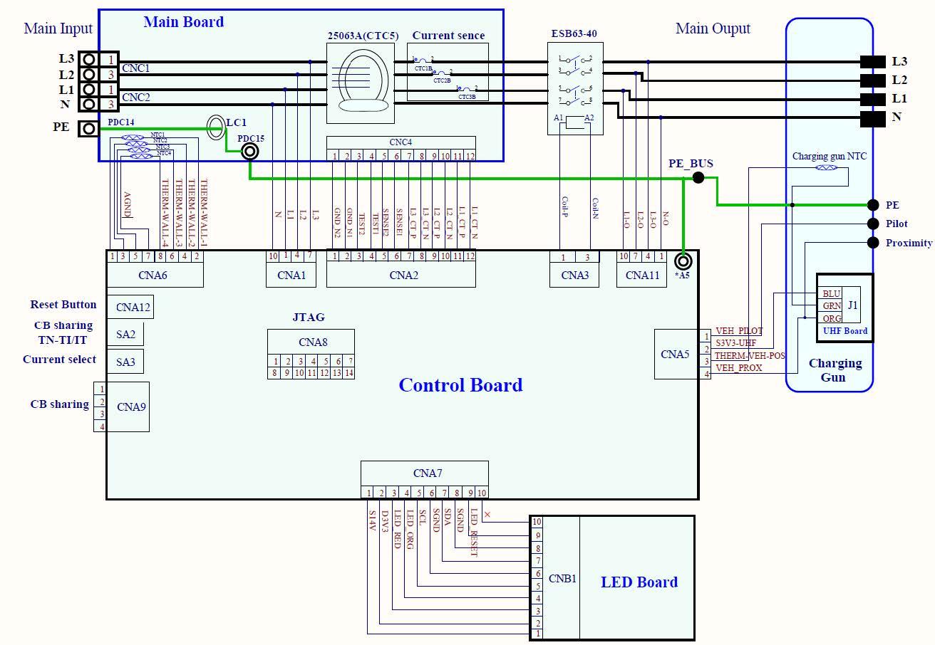 The main power connections are on the main board with NTCs (Negative Temperature Coefficient Thermistor) on connection points. The main board is located below the Control Board, and is not visible or accessible. It contains main input, NTCs, GFCI (Ground Fault Circuit Interrupter) and current sensors. The control board contains DIP switch, rotary switch, internal power supply, four position terminal block for load sharing communication, and four position terminal block for vehicle connector low voltage circuits such as pilot and proximity.