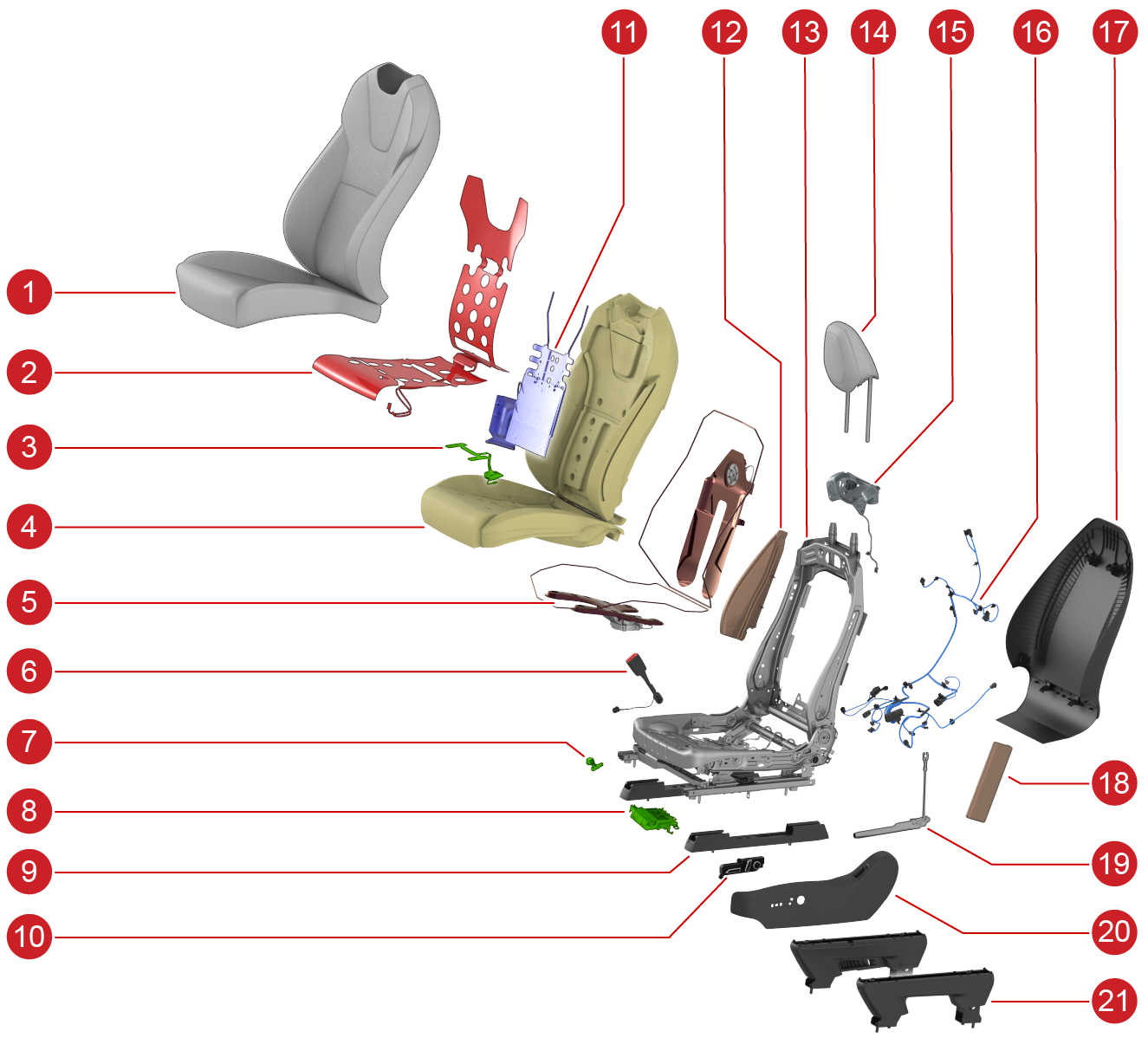 | 1. Cover 2. Heater pad 3. Driver occupancy sensor (also known as seat belt reminder, SBR) 4. Foam/pad 5. Ventilation cushion and backrest fans 6. Seat belt buckle 7. Seat track position sensor 8. Seat controller 9. Seat tracks 10. Seat controls switch pack 11. Pneumatic lumbar support 12. Far side airbag 13. Seat frame 14. Headrest 15. Seat audio/mic 16. Wire harness 17. Back cover shell 18. Side airbag 19. Seat belt pretensioner 20. Side shield 21. Risers |